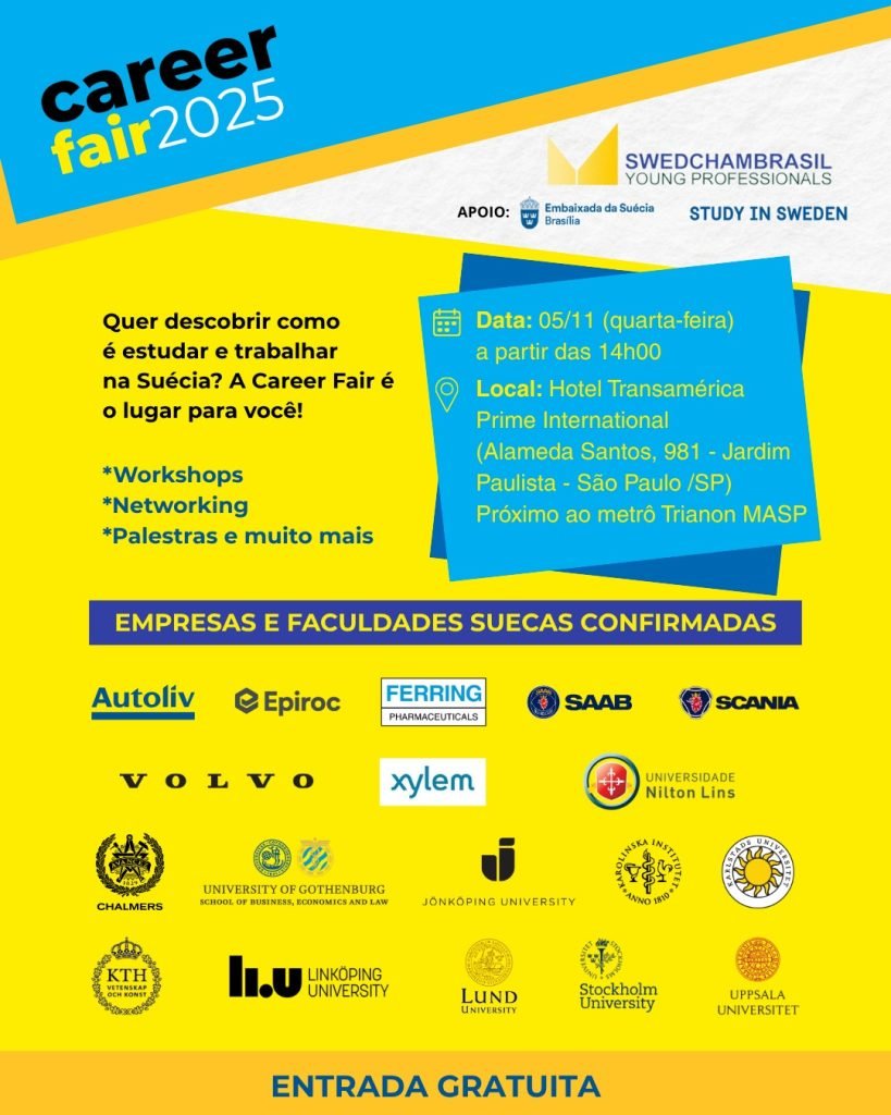 Se você sonha em estudar na Suécia ou conhecer mais sobre as empresas suecas no Brasil, a Career Fair é a oportunidade ideal para conversar com representantes que entendem a sua necessidade de investir na carreira.